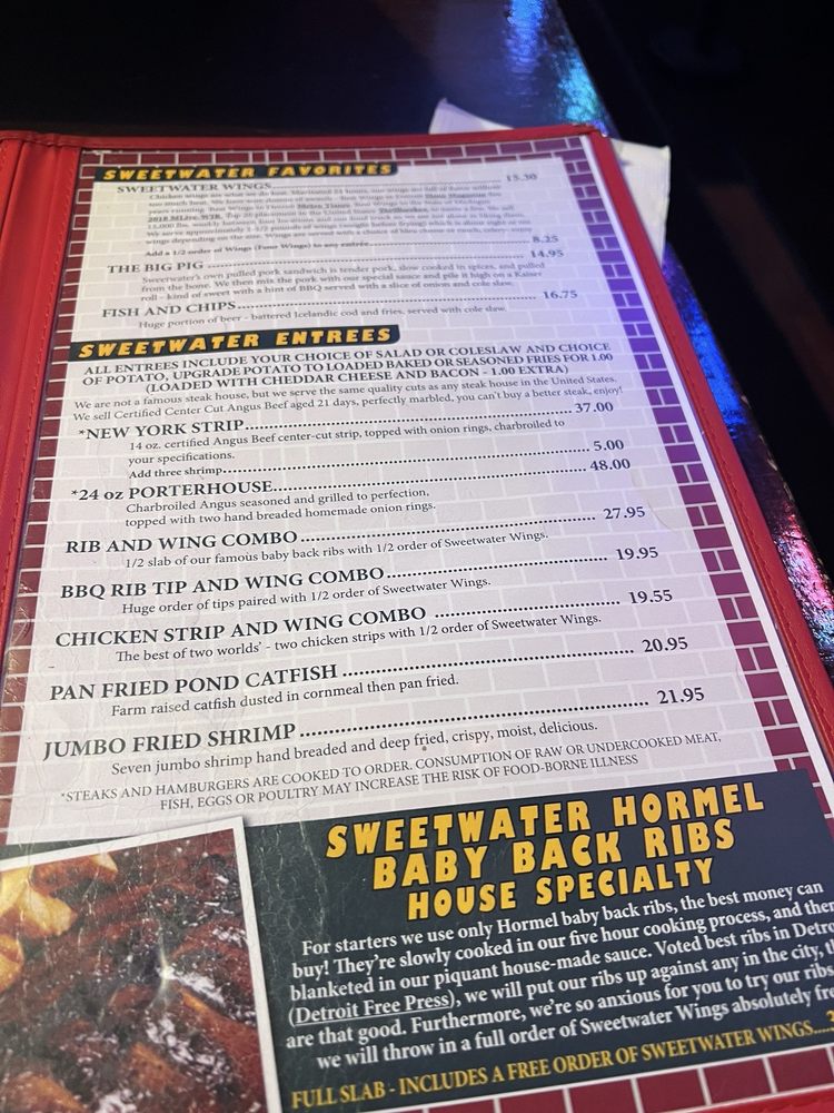 Sweetwater Tavern, located in Detroit, MI, is a popular spot known for its delicious chicken wings and American cuisine. Offering delivery, takeout, and catering services, this casual restaurant provides a cozy atmosphere with moderate noise levels. With a diverse menu that includes vegetarian options, Sweetwater Tavern is a great choice for lunch, dinner, or late-night eats. Customers rave about the meaty and tasty wings, perfectly seasoned fries, and friendly service. The extensive menu also features tasty appetizers like potato skins and fried mozzarella sticks, as well as satisfying salads like the Michigan Cherry Salad and Cobb Salad. Whether you're craving a classic Rueben sandwich or flavorful charbroiled chicken, Sweetwater Tavern offers a variety of mouthwatering options that will leave you satisfied. With a full bar, TV, pool table, and live entertainment on select nights, this tavern is a must-visit for a memorable dining experience.