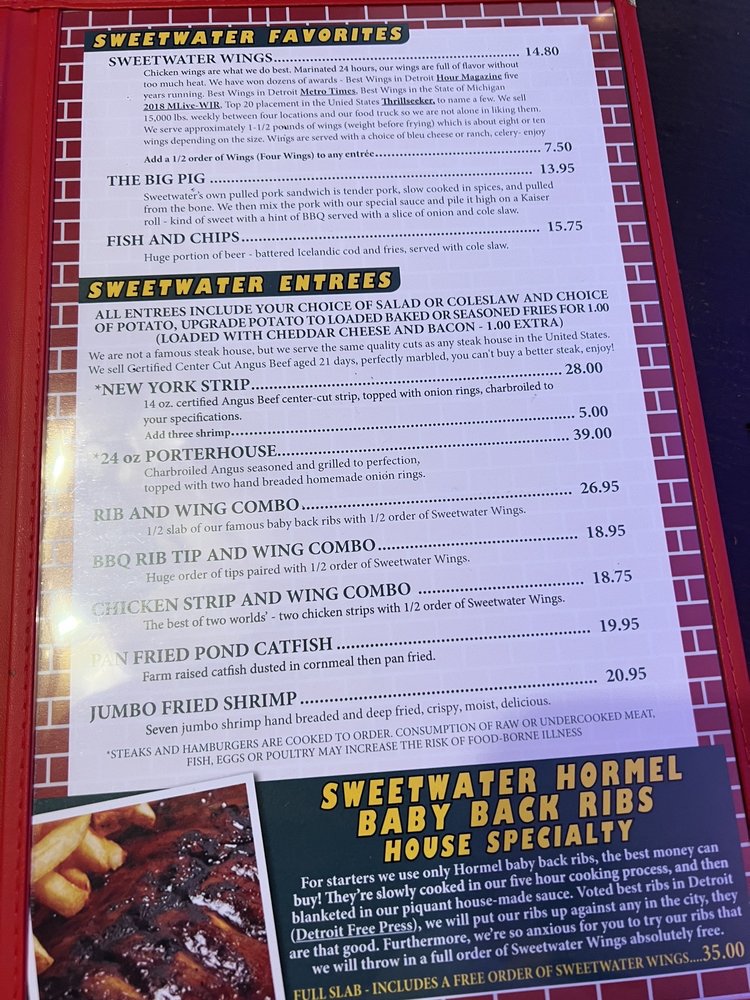 For starters we use only Hormel Special Trim ribs, the best money can buy! They're slowly cooked in our five hour cooking process, and then blanketed in our piquant house-made sauce. Voted best ribs in Detroit (Detroit Free Press), we will put our ribs up against any in the city, they are that good. Furthermore, we're so anxious for you to try our ribs that we will throw in a full order of Sweetwater Wings absolutely FREE.